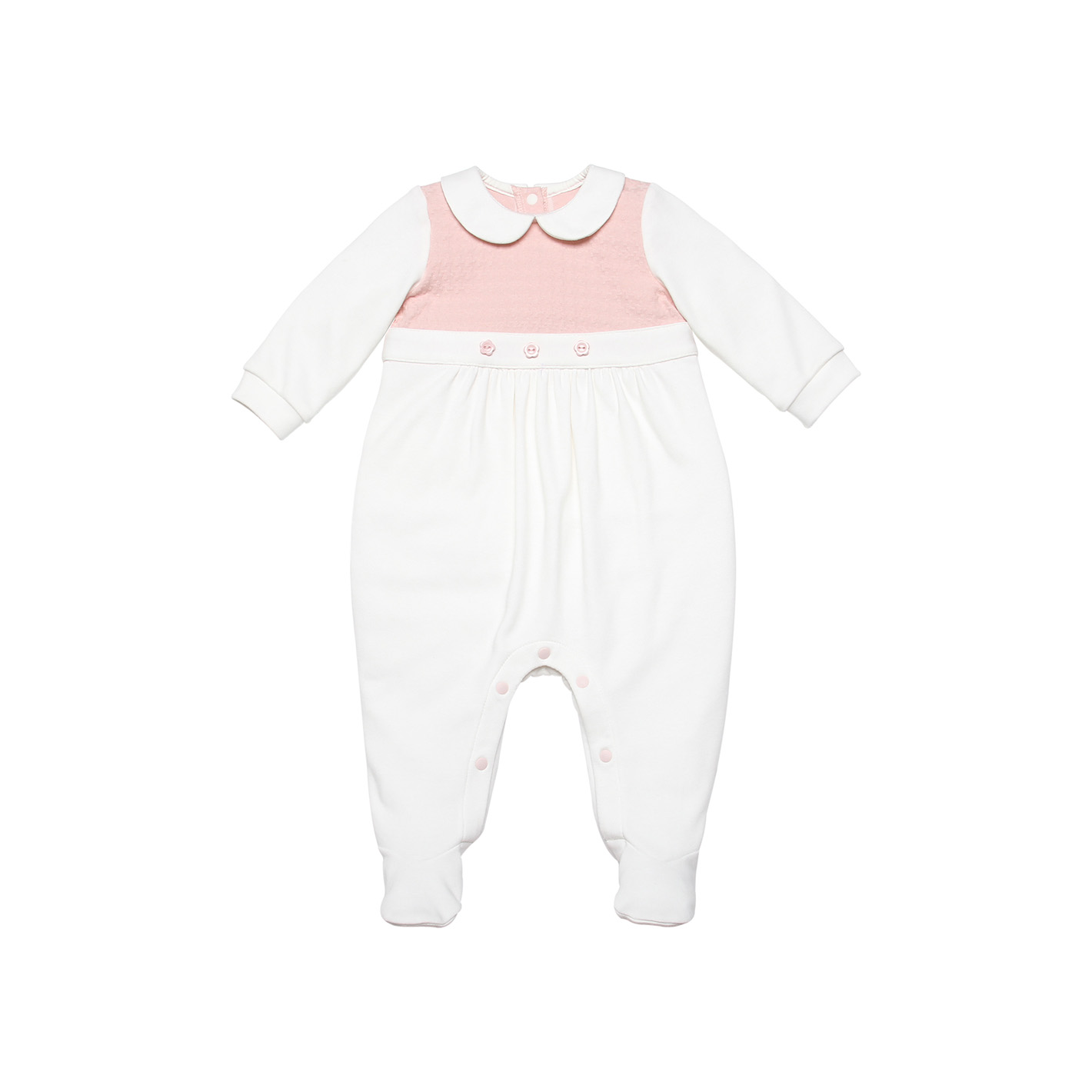 Romper phối trắng – hồng pastel thật nhẹ nhàng, điệu đà, phù hợp với các bé gái. Tạo điểm nhấn cho thiết kế, Bibo's nhấn nhá thêm phần phối màu trước ngực và nhún bèo ở eo, giúp tăng thêm diện mạo đáng yêu cho bé.